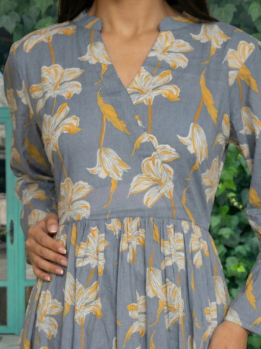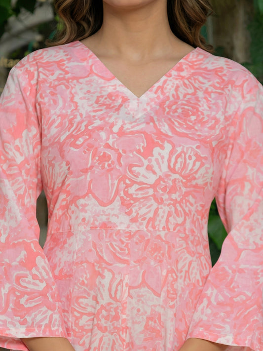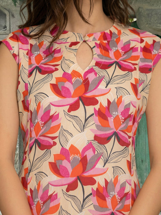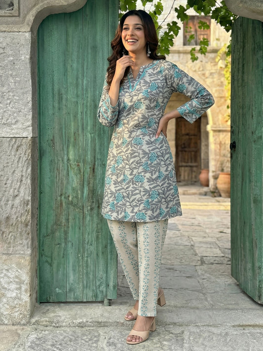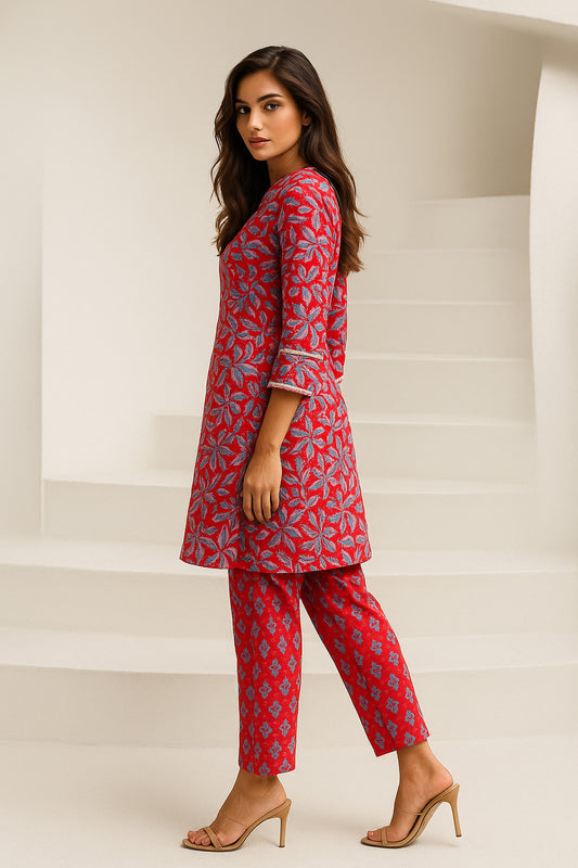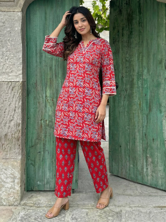 Cream Orange Floral Cotton Co-ord Set with Lace Work