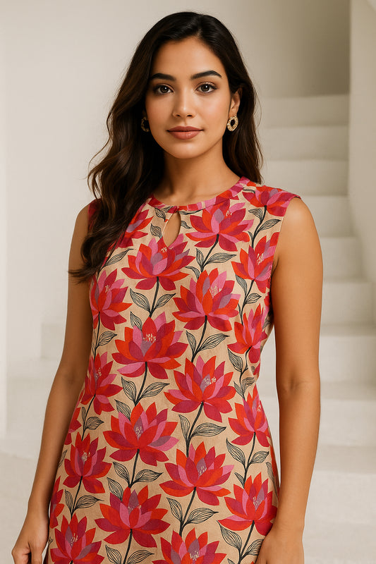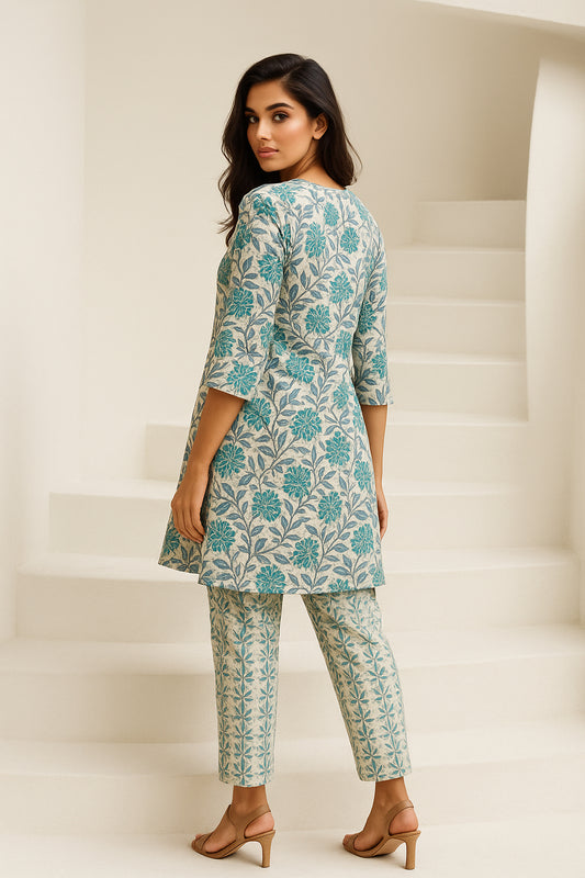 Cream Orange Floral Cotton Co-ord Set with Lace Work
